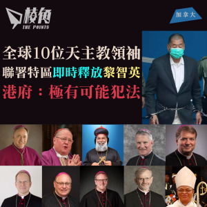 溫哥華大主教J. Michael Miller本月10日與來自世界各地的10名天主教領袖,聯署呼籲香港特區政府釋放已被監禁千日的黎智英。J. Michael Miller表示在溫哥華有不少亞裔信徒非常關注香港局勢,並指天主教徒有義務幫助那些受到不公義迫害的人。