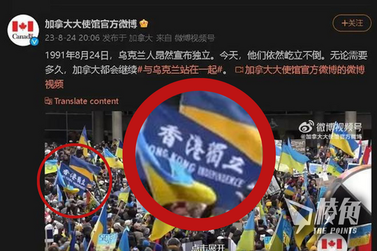 加拿大大使館官方微博上周四(8月24日)上載一段支持烏克蘭的影片,當中出現有人手持「香港獨立」標語的旗幟,令中國網民大表不滿,紛紛到加拿大大使館官方微博留言質問,「表明立場,關於港獨旗幟你們什麽意思?」、「香港是中國的一部分,收回你的髒手」、「請加拿大政府正面回答,是否支持港獨,是否堅持一個中國原則」;亦有人罵加拿大是美國走狗,「沒有主權的國家,任憑人家擺布,真的可悲」。相關帖文及影片目前已被刪去。