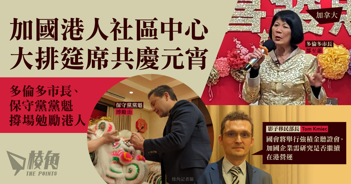 多倫多香港人社區中心於上周六舉辦元宵晚會,獲多倫多市長鄒至蕙、聯邦保守黨黨魁博勵治及自由黨國會議員葉嘉麗等多名政要出席。鄒至蕙在致辭時指,知道移民加國並不容易,但相信港人有能力令社區變得更好。而連續第二年出席的博勵治亦指加國是自由國度,無論來自何地都可以保持自己的傳統。此外,保守黨影子移民部長Tom Kmiec接受《棱角》訪問時,指國會將就加國企業在發放強積金事宜上的角色舉行聽證會,但他們亦要考慮是否要繼續在港營運。