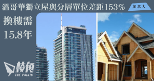 除此之外,報告亦從各省中位年薪收入及獨立屋與分層單位差距作比較,計算換樓所需的年期。以溫哥華平均年薪78,739加元計算,需要15.8年才有換樓可能。多倫多則需要9年半;卡加利需要3年半;愛民頓、溫尼辟、哈利法斯則不足兩年。