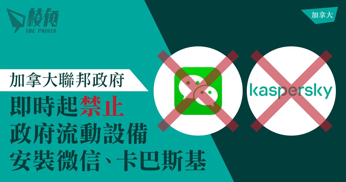 加拿大聯邦政府周一起(30/10)開始,禁止政府官方手機中使用中國的通訊應用程式微信WeChat及俄羅斯製造的Kaspersky應用程式。庫務委員會主席阿南德 (Anita Anand) 在聲明中引用渥太華首席資訊長的決定並表示,該兩款網路應用程式「對私穩及安全造成不可接受的風險」。