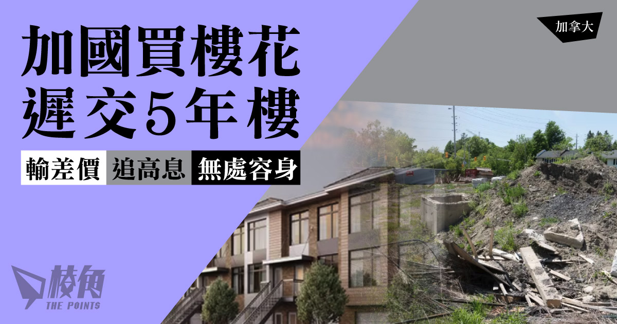 根據加拿大廣播公司(CBC)報導,首都渥太華一個排屋發展區域,有多名業主在2017年至2019年間與當地開發商簽住宅買賣合約後,原預計在2020年初收樓,然而現在仍未交屋,甚至發現該地連施工亦未進行,疑似爛尾,發展商雖然願意退還訂金,但由於樓價於五年來急升,加上利息高企,部份小業主陷於進退兩難局面。