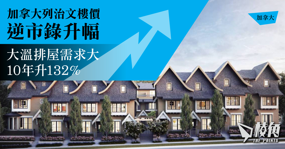 由於新移民多於夏天起行而帶動成交,當中又以排屋(Townhouse)最受歡迎且供應量少,加拿大大溫地區排屋10年累計升幅達132%,預計未來數月此類物業仍有升幅空間。而除了新移民,香港政局不穩情況下多了持加拿大護照港人二次回流加國定居,香港人重鎮的列治文樓價更在逆市下錄得升幅。