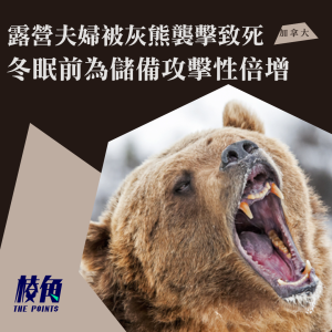 加拿大公園管理局(Parks Canada)接到警報有一男一女及狗於上周五晚(29/9)在班芙國家公園被灰熊襲擊,當局指因天氣條件惡劣,應變小組在翌日凌晨抵達時已發現該對夫婦及其寵物狗已被殺。當局呼籲因灰熊進入冬季前需四出覓食,出外郊遊人士需時常留意郊外環境變化。