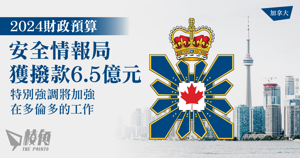 在周二發表的財政預算案中,聯邦政府就提出增撥6.5億元,在未來8年分批提供予安全情報局。在文件中,政府指出作為一個先進及自由民主的經濟體,加國持續成為敵意國家及其代理的目標,威脅民主體制,國內的離散社群及經濟繁榮。