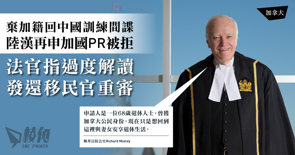 棄加籍回中國訓練間諜 陸漢再申加國PR被拒 法官指過度解讀 發還移民官重審