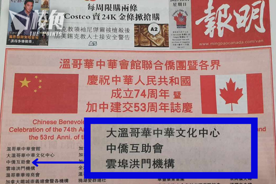 近日,有溫哥華港人發現加拿大《明報》10月1日A1頭版廣告,聯合祝賀中共成立74年的名單上有「中僑」名字,遂電郵該會質詢,指中僑作為提供新移民服務機構,為何祝賀獨裁政權,對此表示十分失望。