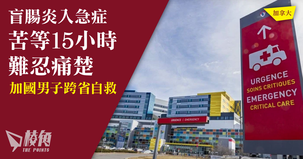 加國醫療短缺情況有幾嚴重?魁省滿地可一名大學生Christos Lianos,因為發高燒及下腹痛楚而到急症室救醫,不過在當地醫院分流站苦等15小時仍未有醫生診症,最後Christos Lianos需要由父母開車跨省至安省京士頓醫院時被診斷為盲腸炎後,入住深切治療部治療。