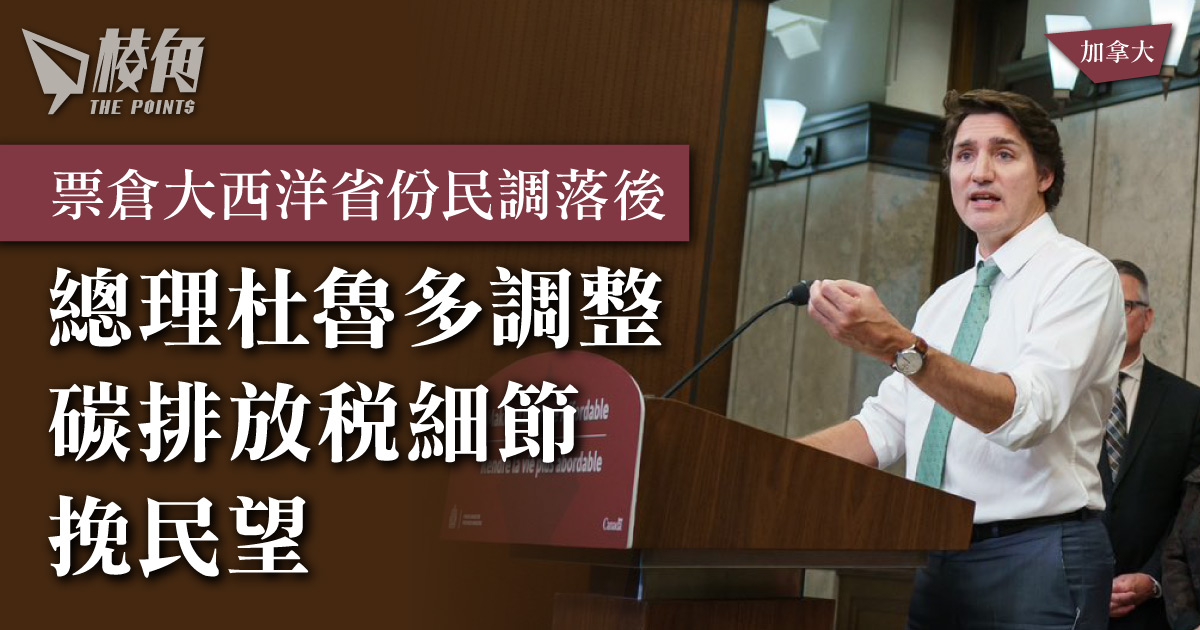 總理杜魯多在面對民意壓力下,公布調整碳排放稅的部份實施情況,包括未來三年將暫停徵收暖氣用燃油的相關稅項,同時將增加向鄉鎮居民提供的碳排放稅回扣等,試圖挽回於大西洋省份因推行該稅而流失的支持。保守黨近日以碳排放稅推高生活成本為主題在大西洋省份進行宣傳,成功將支持率提升並拋離自由黨。