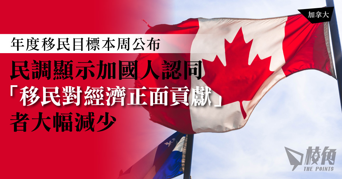 加拿大聯邦政府將於本周公布最新年度移民目標人數。兩份民意調查顯示,加國國民對移民的支持有明顯跌幅,當中,雖然仍有超過7成國民認同「移民對經濟有貢獻」的說法,但較去年相比,同意人數大跌一成一,而非常認同或認同「加國有太多移民」的人數,上升一成七,當中在大多倫多地區,近六成人認為移民過多。不過,調查亦顯示國民對移民的實際情況非常不了解,如37%受訪者誤以為本國每年吸納超過25萬難民,但實際只有7.6萬人。有意見認為政府應加強對移民政策的宣傳。