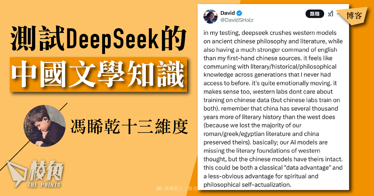 Holz測試DeepSeek,認為它在中國古代哲學與文學方面的表現超越西方模型,又說「中國的文學歷史比西方多了幾千年」、「我們的人工智能模型缺少西方思想的文學基礎,而中國模型則保留了」。這樣的評價,恕我不敢苟同。