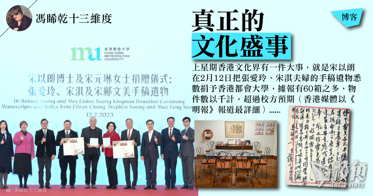 上星期香港文化界有一件大事,就是宋以朗在2月12日把張愛玲、宋淇夫婦的手稿遺物悉數捐予香港都會大學,據報有60箱之多,物件數以千計,超過校方預期(香港媒體以《明報》報道最詳細)。當日的捐贈儀式有網上直播,那天我沒有空,昨晚才在bilibili網站找到影片回看( https://t.ly/Pg6xx ),以下是我的一點感想。