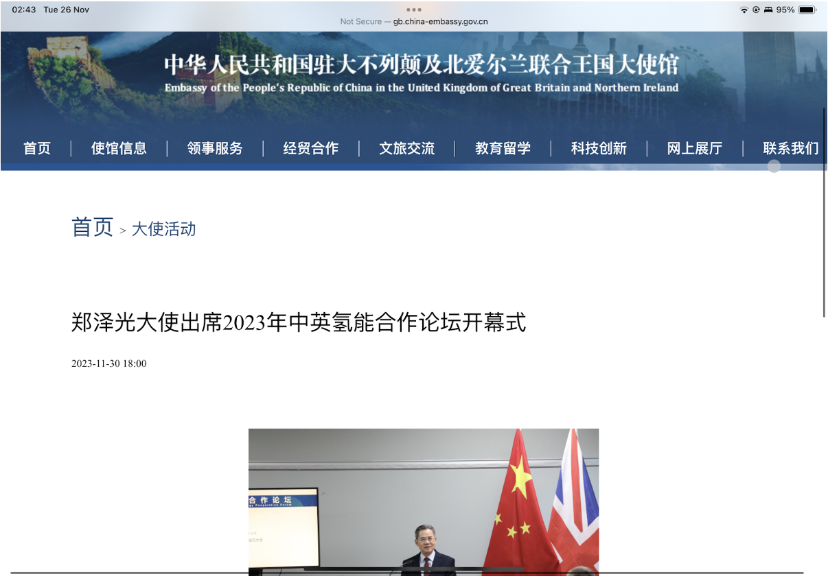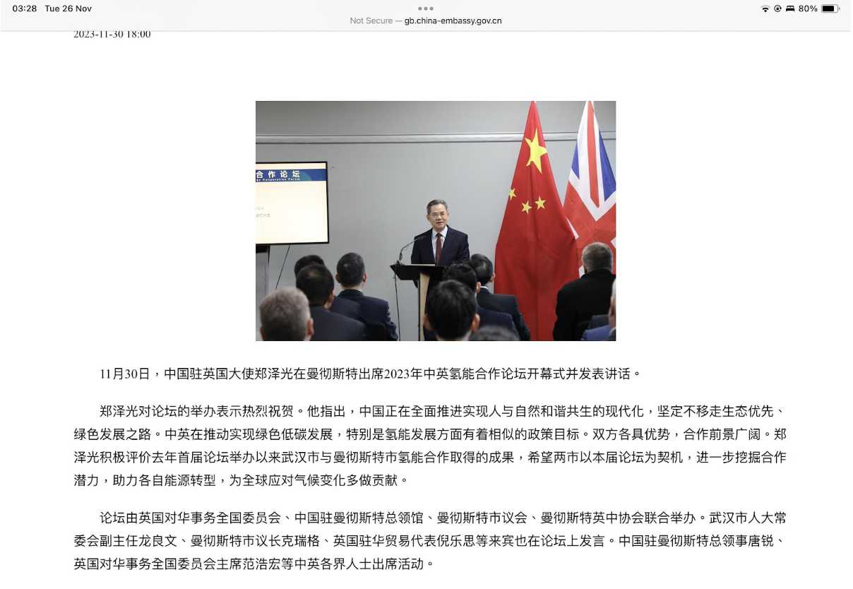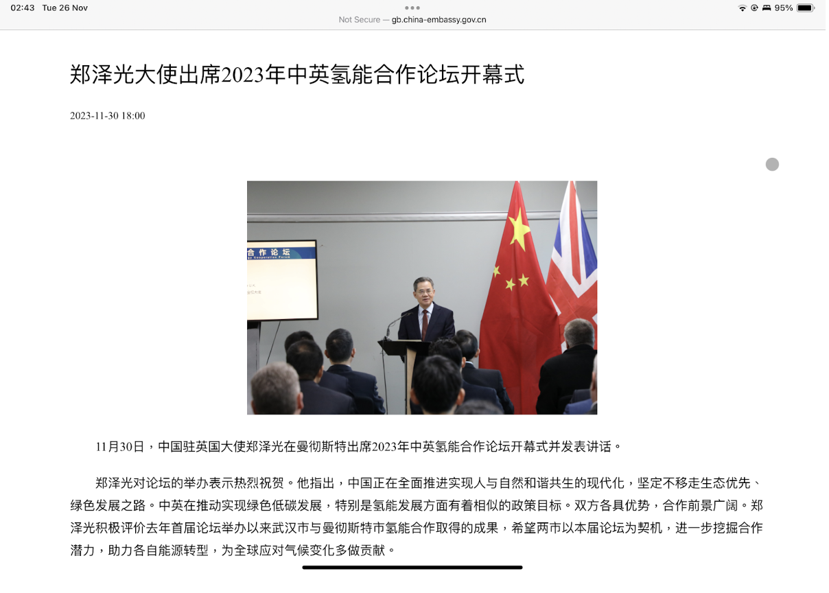 英國對華事務全國委員會(UKNCC) 與中國駐曼徹斯特領事館、曼城中國論壇合辦2023年中英氫能合作論壇 http://gb.china-embassy.gov.cn/dshd/202312/t20231201_11190673.htm
