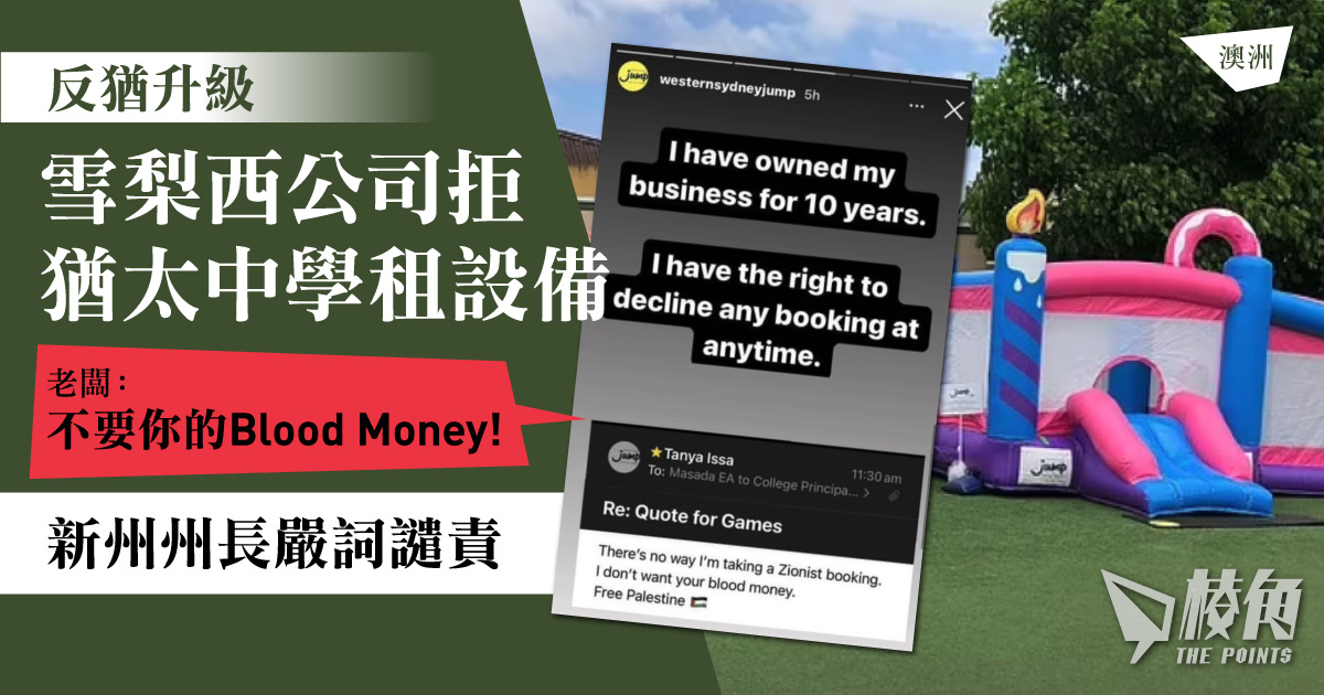 自10月7日哈馬斯襲擊以色列造成逾1400人死亡,及劫持200多名人質事件發生後,澳洲多個城市連續多周有親巴勒斯坦示威,本地以色列及巴勒斯坦社區衝突事件頻仍,最近雪梨一間猶太中學向一家位於雪梨西區的慶典及戶外活動公司租用設備,遭該公司負責人拒絕並說:「不要你的Blood Money!」。新州州長范明思Chris Minns對反猶行為表示憤怒,州政府當局必須進行調查。