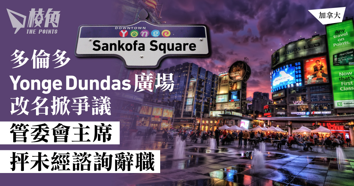 多倫多市議會上周通過,將位於市中心的Yonge-Dundas 廣場改名為Sankofa廣場,以回應以 Dundas 登打士作地名的爭議,及代替將整條登打士街改名的計劃。不過,由市府委任的管委會主席及副主席,先後辭職。他們表示同意改名的計劃,但不滿市議會在作出該改名決定前,未有先諮詢管委會及公眾。