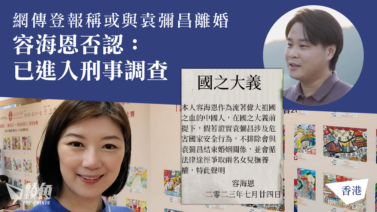 香港警方國安處早前懸紅100萬通緝 8 名海外流亡港人,其中袁弓夷子女袁彌昌、袁彌望,及媳婦立法會議員容海恩周一(24日)清晨被帶走調查。今日網傳一幅下款為「容海恩」的聲明,稱「假若證實袁彌昌涉及危害國家安全行為,不排除與袁彌昌結束婚姻關係」。多家傳媒引述容海恩回覆查詢,否認聲明由她本人撰寫,又指事件已進入刑事調查,不便評論。