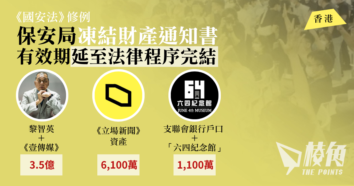 港府周五(15日)公布已修訂《國家法》第43條實施細則,列明由保安局長發出的凍結財產通知書,其有效期由「兩年」改為直至相關的法律程序完結。若涉及《國安法》的個案偵查及審理程序,不能在通知書有效期屆滿前完成,法府可批准延期,即日生效。《棱角》整合以往報道,警方國安處曾多次引用《國家法》第43條,凍結涉違反《國安法》被告人的資產及物業,包括「黎智英案」、「《立場新聞》案」、支聯會等,涉及金額估計超過4億港元。