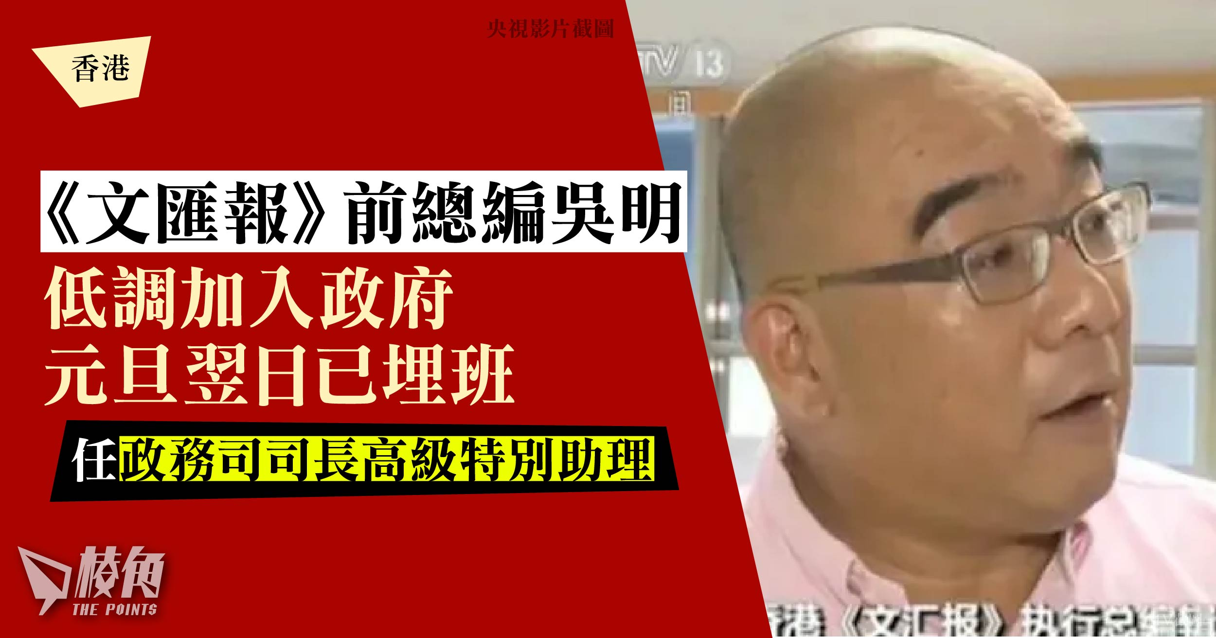 去年突然辭任《文匯報》總編輯一職的吳明,被傳媒發現周四(2日)出任政務司司長高級特別助理,但政府未有發公告。根據「政府電話簿」網頁顯示,吳明隸屬「政務司司長私人辦公室」。政府回應傳媒時表示,吳明被任命非公務員職位,以協助政務司司長陳國基進行中國的政策研究工作。