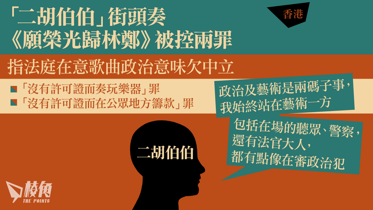 據《庭刊》報道,曾多次在街頭以二胡演奏《願榮光歸香港》,69歲的「二胡伯伯」被控多項無牌演奏及籌款等罪,今(24日)於沙田裁判法院續審,案件被裁定表證成立。被告李解新向裁判官陳慧敏表示,審訊過程和大家的著眼點一直圍繞樂曲的政治意義,希望法庭保持中立。他否認全部控罪,指因申領牌照後演奏仍然要逐次填表申請,加上他事前不知道在公眾地方籌款須許可證。
