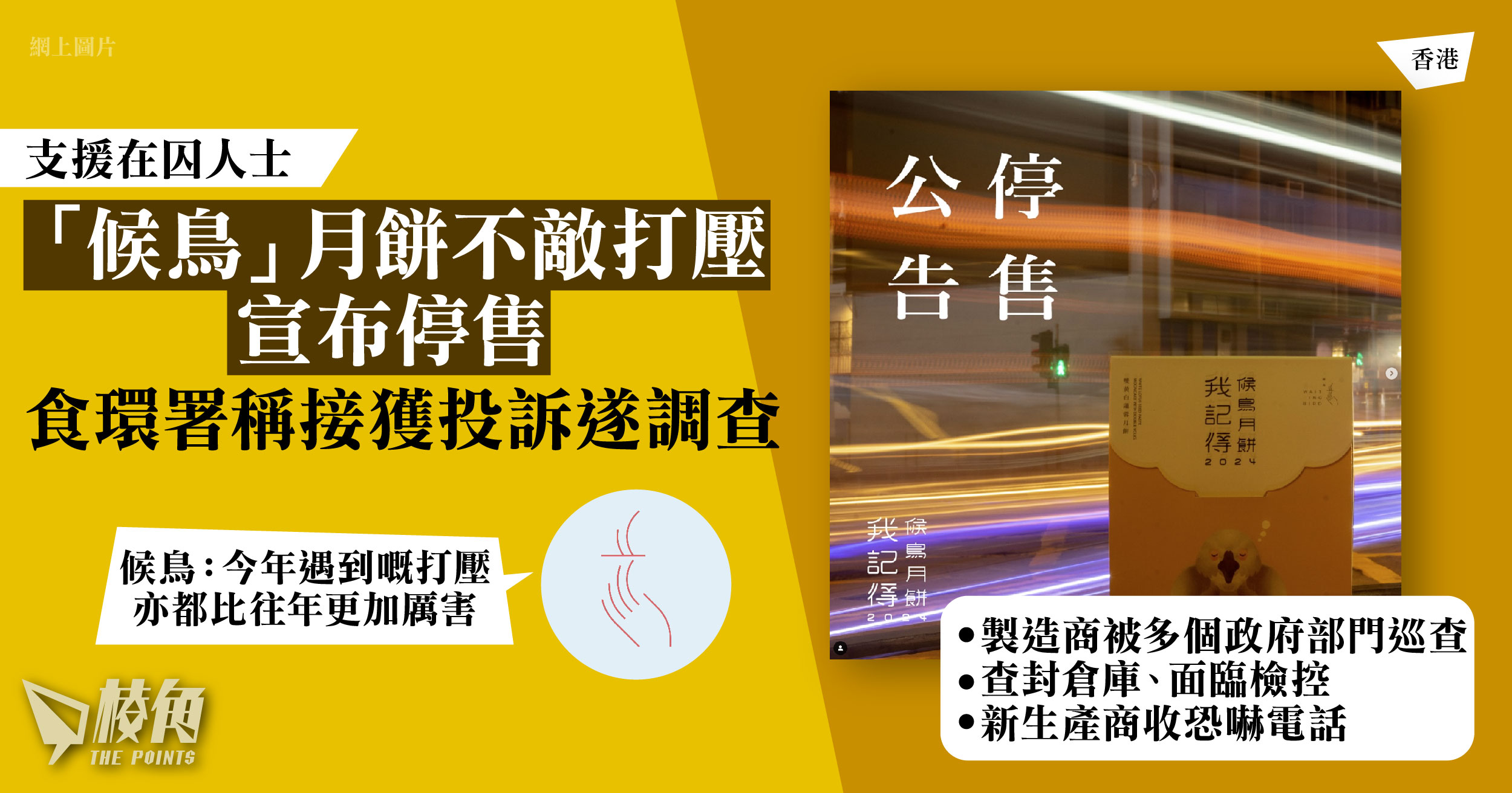 「候鳥」在帖文提及,自今年8月初第一批月餅成功出貨後,「候鳥」及月餅製造商受到的打壓「如狂風暴雨地襲來」,包括香港餅盒生產商,其於中國的合作廠房被當局查封,所有月餅盒被強制銷毀;月餅製造商被香港多個政府部門巡查,最後更被查封倉庫、多次問話面臨檢控;其後製造商介紹另一月餅盒生產商,該生產商便收到恐嚇電話,表示掌握其家庭成員資料,「如果出貨俾我地嘅話,後果自負。最終所有尾數無法交付。」