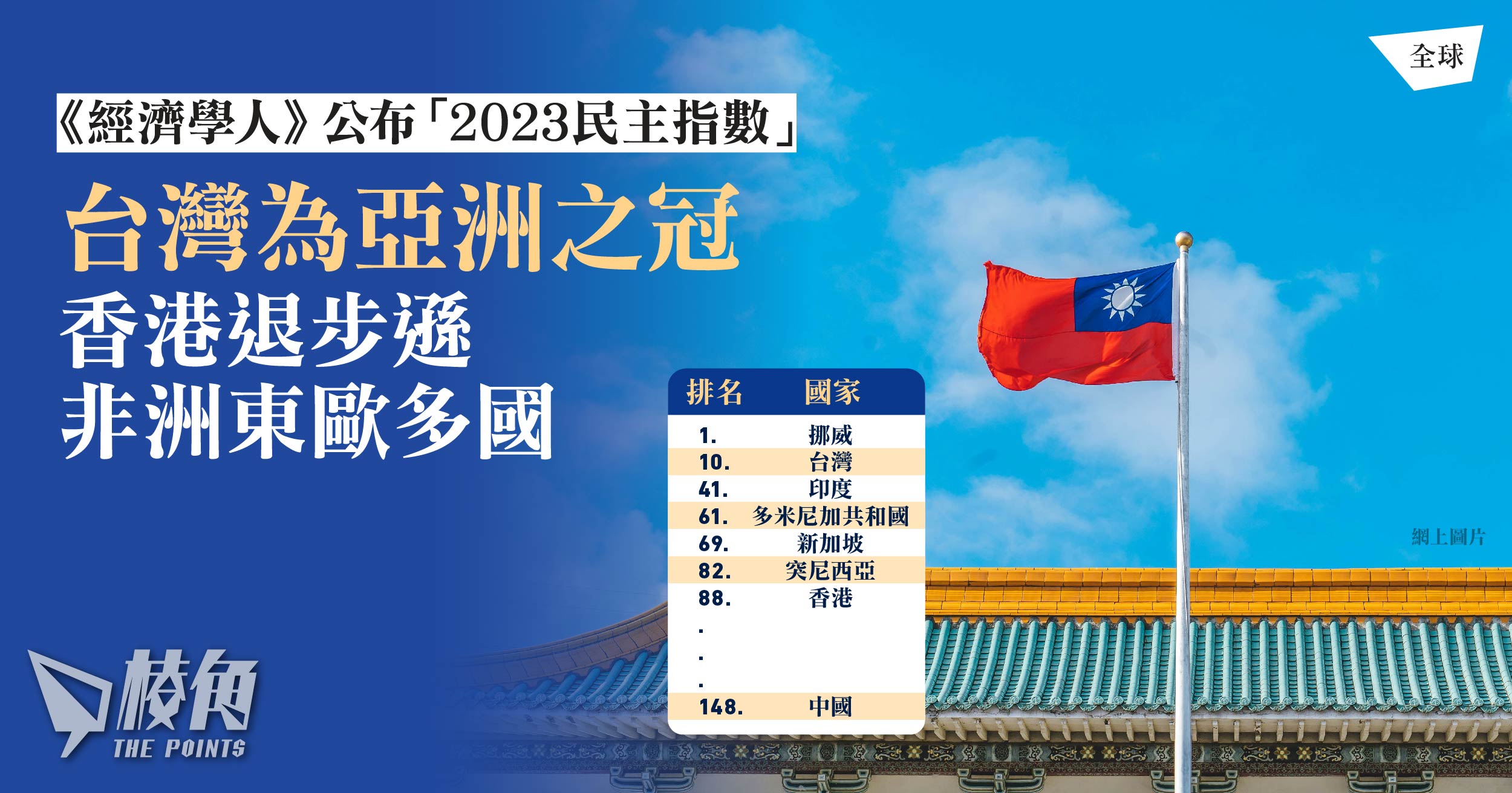 英國《經濟學人》期刊《經濟學人資訊社》(EIU)周四(15日)發表「2023民主指數」報告,在全球167個國家及地區中,台灣排名第10,為最高排名的亞洲國家及地區;新加坡排名69;香港排名88;中國則排第148名。台灣被EIU定義為「完全民主」;香港的排名雖與去年相同,但評分則稍微下降,排名落後多個非洲、東歐及發展中國家。