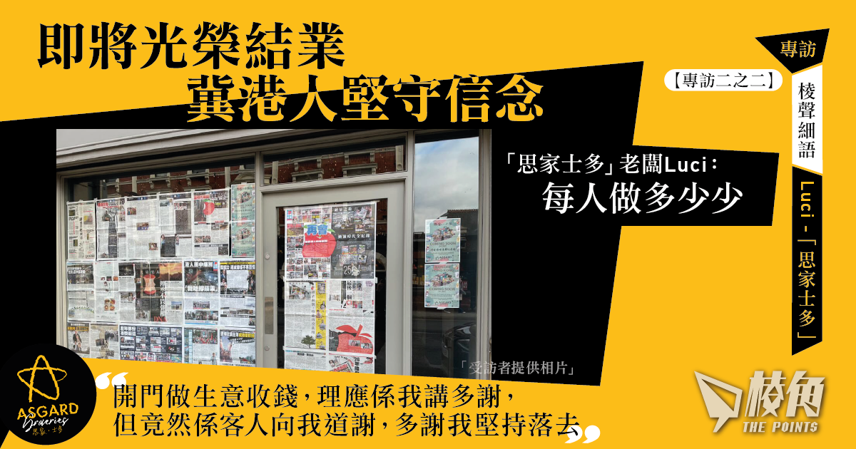 陪伴曼城港人的「思家士多」即將結業,正值老闆Luci入伍英軍前夕,他向《棱角》透露離別心情,回顧在英創業的經歷,感激港人支持。即使做老闆不是優差,收入甚微,但他仍然享受,無悔兩年來付出的心力及汗水。