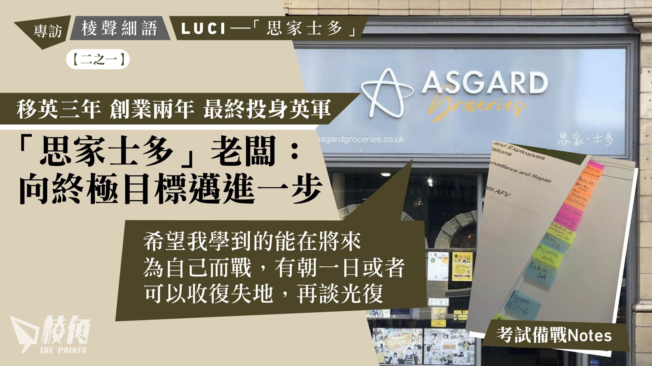 小時候總會寫過《我的志願》,作為香港人,想必大家鮮有想到要成為一名軍人。「思家士多」老闆Luci亦不例外,移英三年,在曼城開鋪賣香港食品和手作品兩年,上周宣布自己已通過英軍入職考核,即將入伍接受訓練,士多亦會結束營業。他接受《棱角》專訪,分享投考英軍的心路歷程和目標,感謝一直給予他鼓勵的同路人。