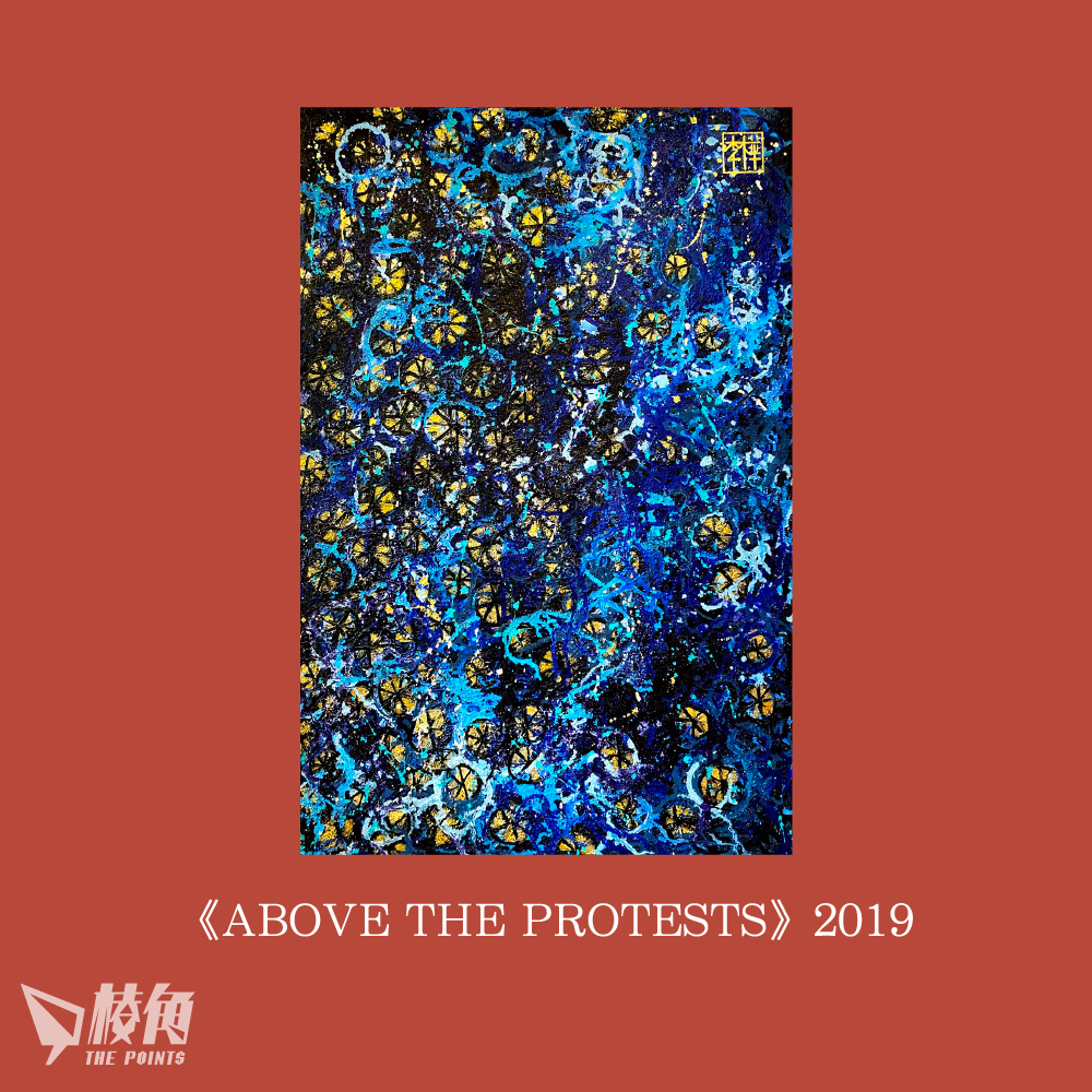 《ABOVE THE PROTEST》系列是他在2019年「反修例運動」期間創作的。在其中一幅畫作中,數十個黃色的圓形被深淺不一的藍色包圍,凌亂地散落。Martin說,這是一個由雨傘、旋轉的催淚彈、催淚彈頭、水炮車及水柱組成的系列,看似多幅鳥瞰圖,從高空俯視著示威情況。「藍色的是我選的第一種顏色,因為水炮發射的催淚水劑是藍色的,還有白色的煙霧和催淚彈。其他作品中我亦有加入紅色的雨傘,象徵當時的暴力及示威者受傷流血」。
