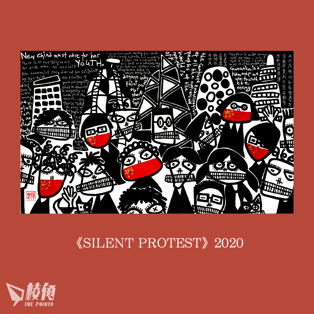 「如果你還記得示威(反修例運動)開始前,戴口罩遮臉是違法的,對吧?但過了不久,不戴口罩反而違法。真可笑,真的太可笑了。」Martin另一個創作系列《SILENT PROTEST》,正正記載着2020年疫情爆發後,港府政策的自相矛盾。他表示參考了紐約塗鴉藝術家Keith Haring的創作風格,保留黑白「漫畫風」,香港背景、港人髮型、配上鮮紅色中國國旗口罩,形成強烈對比。畫中亦加插了中國共產黨創黨主席毛澤東編寫的《毛主席語錄》字句,「我在閱讀時,發現很多香港示威者的訴求,其實和他說的一樣。他說為人民服務,誰都可以批評共產黨,新中國必須照顧青年。我覺得這是十分諷刺。」