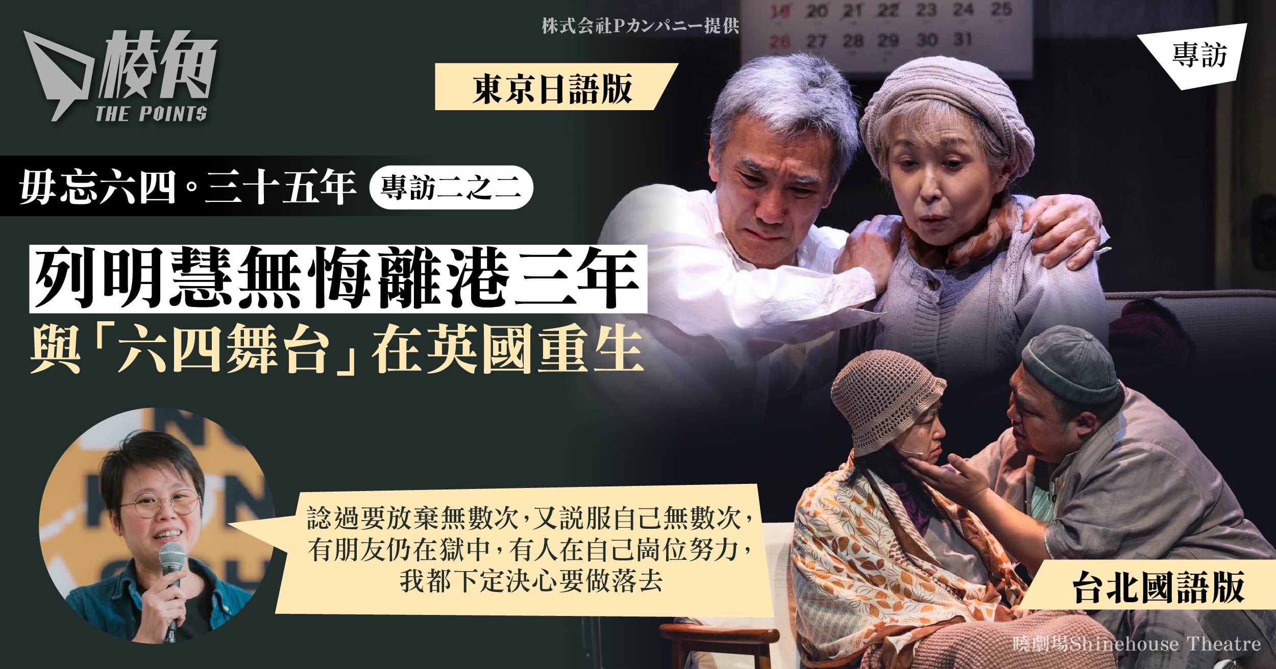 《國安法》實施後,香港獨有的專屬畫面逐漸褪色,歷史足跡、人物也逐一消失。前支聯會義工、「六四舞台」創辦人列明慧亦帶同《5月35日》版權離開香港,移居英國。經歷到埗初期的煎熬、無數次自我懷疑和心情起伏,最終決定在異鄉繼續用自己的方式「說好香港故事」。她接受《棱角》專訪,宣布「六四舞台」將劇目《5月35日》帶到倫敦以英語演出(詳情請閱讀上一篇文章),希望藉演出為港人帶來堅持的力量。