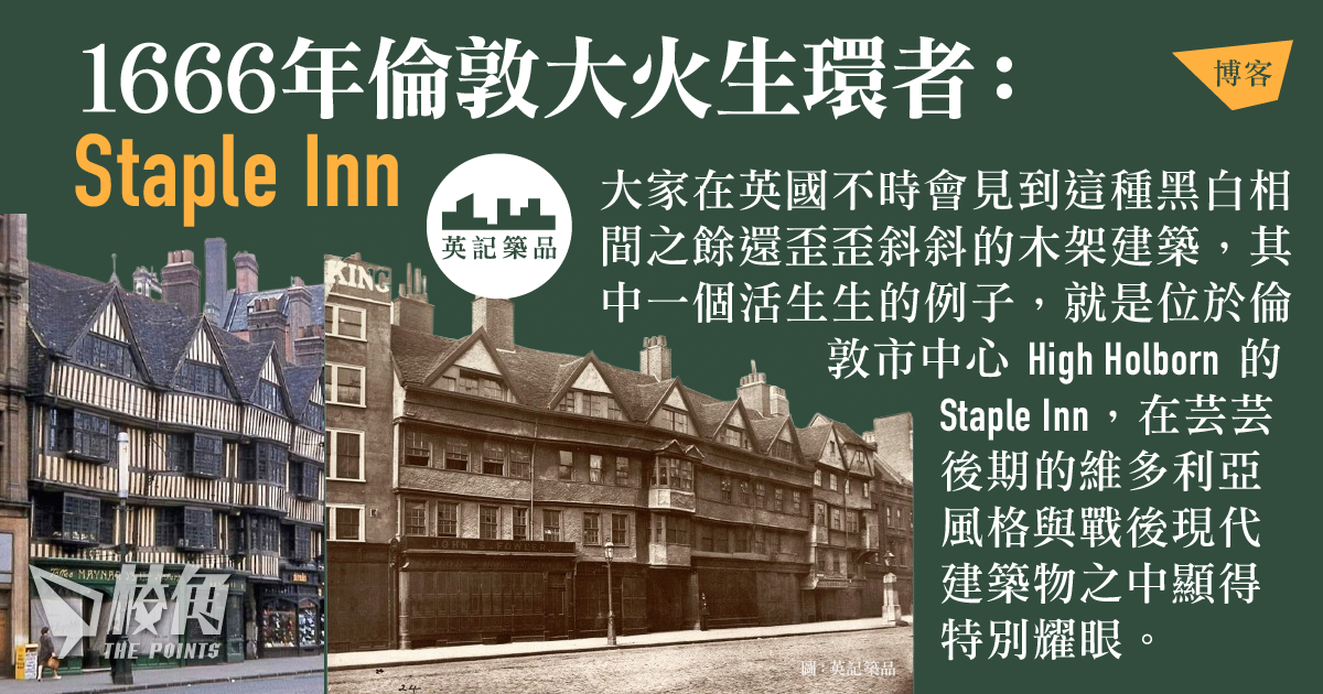 大家在英國不時會見到這種黑白相間之餘還歪歪斜斜的木架建築,其中一個活生生的例子,就是位於倫敦市中心 High Holborn 的 Staple Inn,在芸芸後期的維多利亞風格與戰後現代建築物之中顯得特別耀眼。