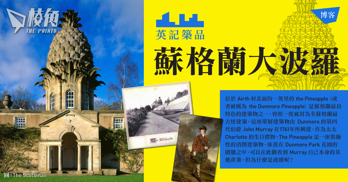 位於 Airth 村北面約一英里的 the Pineapple (或者被稱為 the Dunmore Pineapple) 是蘇格蘭最具特色的建築物之一,曾經一度被封為全蘇格蘭最古怪建築。這座單層建築物由 Dunmore 的第四代伯爵 John Murray 在1761年所興建,作為太太 Charlotte 的生日禮物 (亦有可能是結婚禮物)。The Pineapple 是一座裝飾性的消閒建築物,座落在 Dunmore Park 花園的圍牆之中,可以在此觀看到 Murray 自己本身的其他產業,但為什麼是波羅呢?