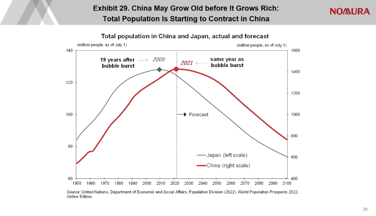 人口老化對經濟的影響剛好與人口紅利相反,一般商品(醫療藥物除外)的消費會減少,政府的稅收會減少,老年人需要耗用儲蓄或賣資產維持生活,令可用作資本投資的資金減少,這些都會使中國經濟難有增長,甚至萎縮。中國的人口老化比日本的來得更不合時(見圖四)。日本在90年泡沫爆破,人口老化雖然明顯,但真正人口下降是2009年,外圍經濟還繼續增長了30年,更不要說日本人已經富起來擁有全球最大的積蓄。2019後中國泡沫爆破,正好與人口見頂同步。日本跟西方國家都有為國民的退休金撥備,足夠與否是另一問題,而中國是沒有的。中國要為退休人士提供任何免費福利,只可通過對正在工作的人徵稅或濫發鈔票。中國昰典型的未富先老。當然這不代表經濟會必然崩潰,但強國夢注定泡湯。