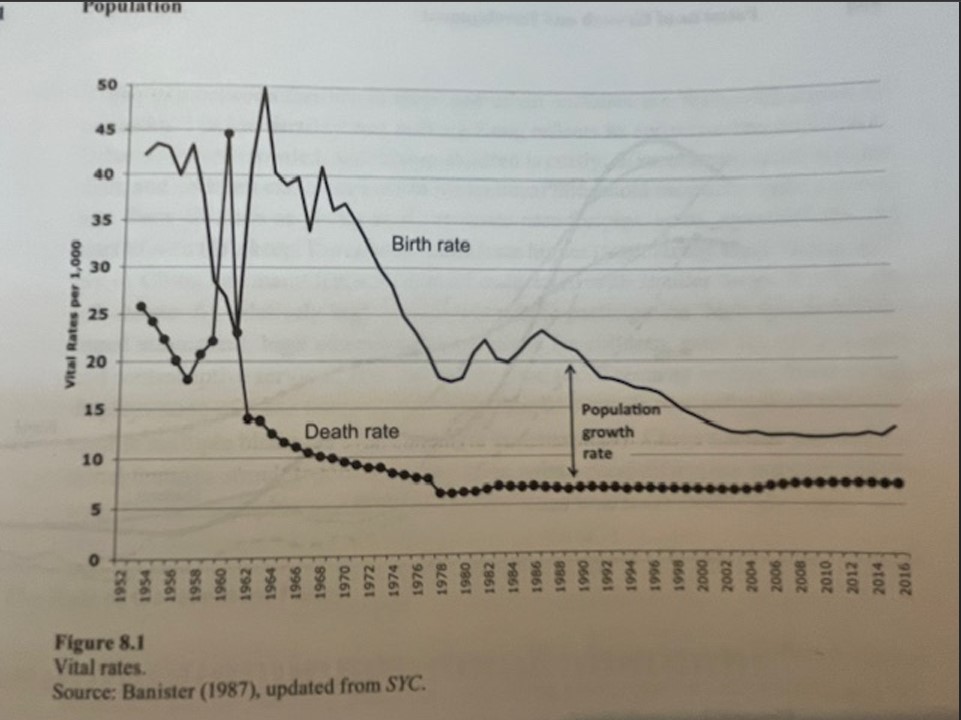 中國人口在解放前100年的增長率約每年0.3%,每年的出生率是每千人達30至40人,死亡率則在每千人20至40人之間波動,主要看農業收成的好壞和有否社會動亂。「總和生育率」(TFR total fertility rate),指每一名婦女一生平均生育的子女數目,70年代前一般維持約6名。值得注意的是假如TFR低於2.1,無論死亡率的高低,人口必然減少,只是時間問題。 中國在解放後到1970年仍維持每千人35至45人的高出生率,唯一的例外是1959至1961年因大躍進帶來的飢荒使出生率低於30。死亡率則因為醫療衛生的改善,從1961年的每年近20人減至70年的6人(見圖一)。結果是中國人口從1953年第一次人口普查的6億,到1970的8億2千多萬,增加了37%。政府在70年間開始因擔心人口過多,開始推行計劃生育,鼓勵遲婚、遲生育和通過避孕不生多於2名子女。1980更全面實施一孩政策。