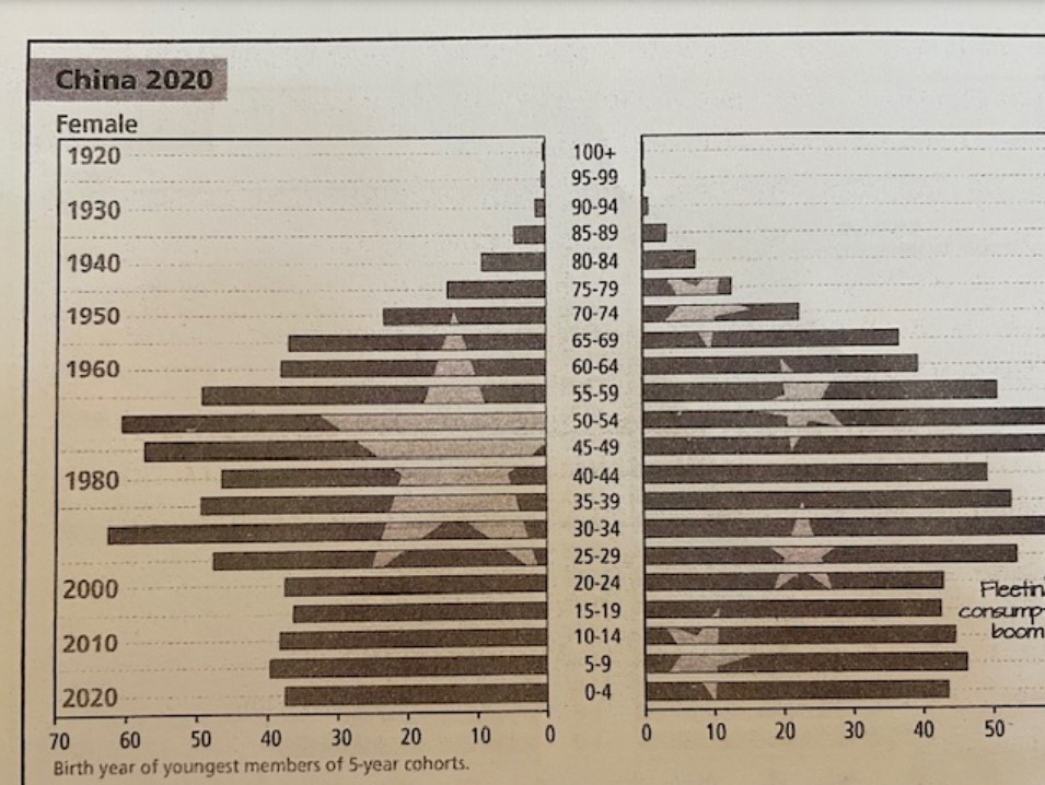 從圖二和圖三我們可以看到中國人口結構從1980到2020年的變化,現時已經不再是金字塔,而是中段闊而下窄。我們在上面說過只要TFR低於2.1,就注定未來人口必然收縮,而一孩政策的35年間TFR只可以是1。2015年中共開始憂慮人口老化,開始放寬生育和取消一孩政策,這幾年更鼓勵生育,但出生率並沒有增加,2022年TFR只達1.09%。中國適齡的勞動人口在2014年已經見頂,佔總人口的73%。當時的撫養率為37%, 2022年已上升至46.6%,2050年更估計會達80%,適齡勞動人口會較2020年減少1億4千萬。中國由於法定退休年齡較早,男性60歲,女性50至55歲,所以即使2030後的2至3年,中國的人口比例將會是4個退休人士:2個適齢工人:1個小孩子。