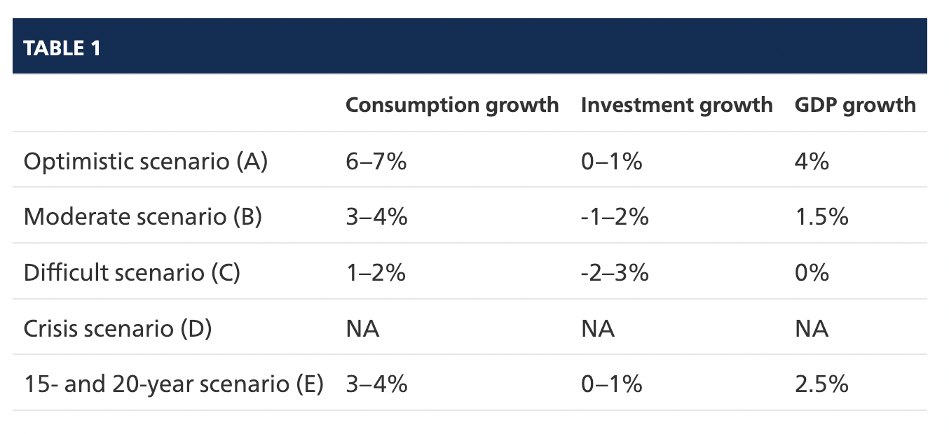 在中國經濟已經開始下跌,地產泡沫正在爆破和失業率上升的情況下,他最樂觀的情景(A)根本不會出現,假如是較樂觀的情景(B),未來10 年GDP每年的增長只會是1.5%。說實話,筆者認為危機情景(D)才是最大的可能,因為直到現在中國政府還沒有提出具體的改革措施。