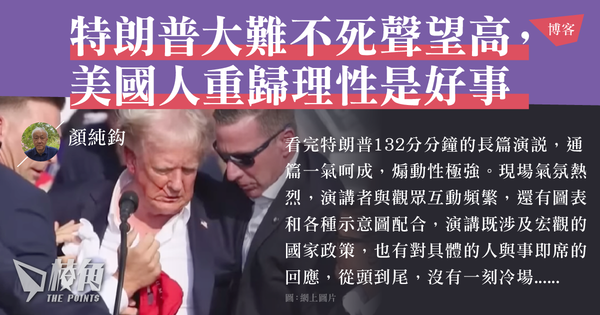 這一次大選前,兩黨也卯足力氣,立定馬步,準備決一生死,但特朗普被刺的事件卻提醒美國人,政治上的對立如果不加節制,可能會傷了自己,可能破壞行之久遠的合理制度,使美國的憲政體制受到損害。相比起由誰執政的一黨之私,整個國體的敗壞更致命,因為今日的競選,就是建立在一個共同擁有的制度之上,制度毀了,你死我活,沒有人會從中得益。