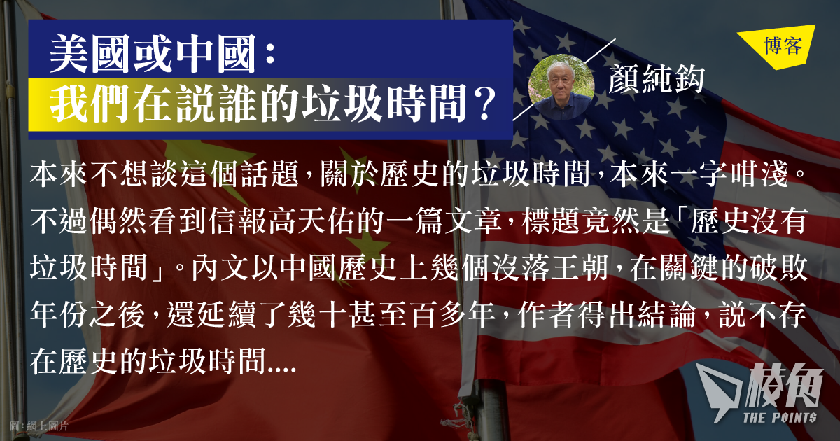 本來不想談這個話題,關於歷史的垃圾時間,本來一字咁淺。不過偶然看到信報高天佑的一篇文章,標題竟然是「歷史沒有垃圾時間」。內文以中國歷史上幾個沒落王朝,在關鍵的破敗年份之後,還延續了幾十甚至百多年,作者得出結論,說不存在歷史的垃圾時間。