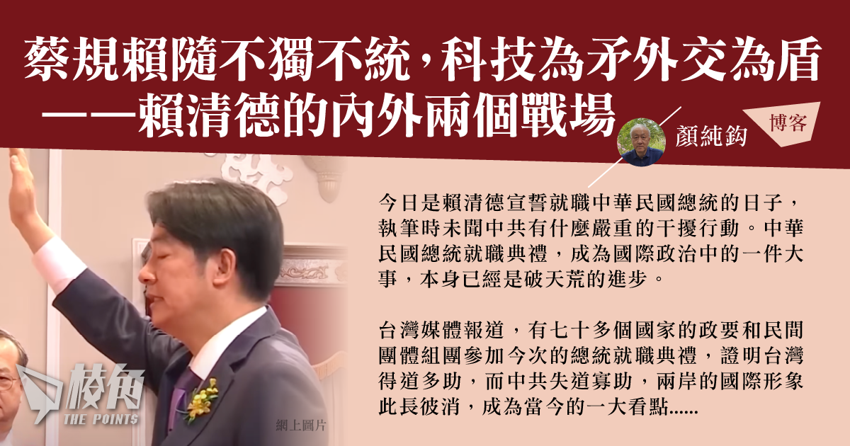 今日是賴清德宣誓就職中華民國總統的日子,執筆時未聞中共有什麼嚴重的干擾行動。中華民國總統就職典禮,成為國際政治中的一件大事,本身已經是破天荒的進步。