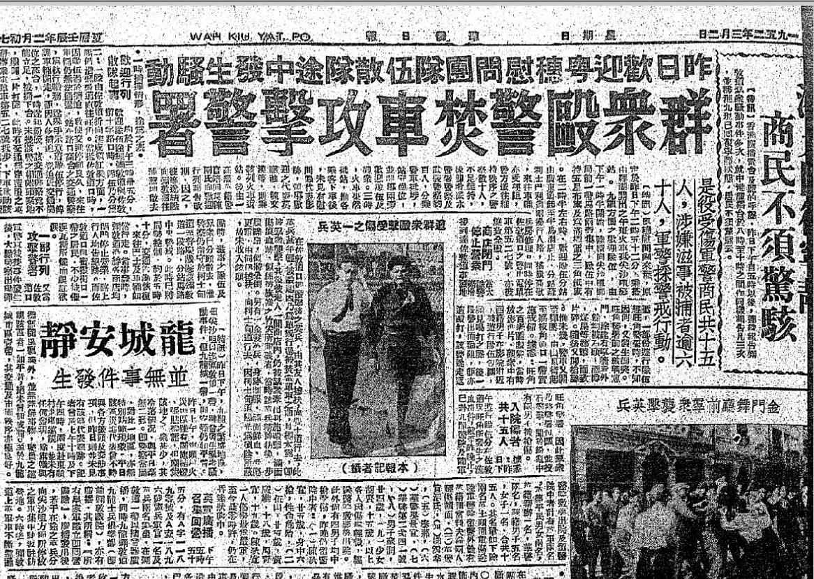 《工商日報》1952年3月2日報道,3月1日下午4點50分左右,群眾包圍旺角警署,並向警署投擲石塊,高呼「打倒xx帝國主義」,「消滅X X」口號,警司下令警員退守署內,採防衛態度,「但群眾竟擬從正門闖入警署內,結果警方採取必要措施,立即投擲催淚彈及以手槍向群眾射擊,其中一警員並放槍制止從正門擬闖入警署內之群眾,當堂擊傷群眾中之男子三人。」