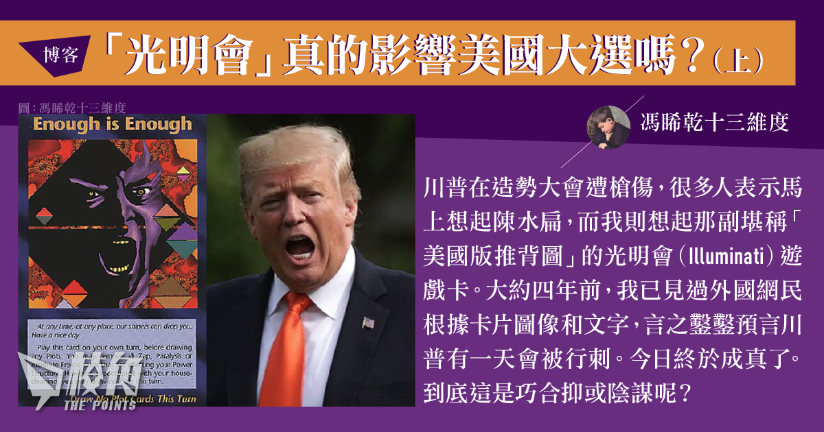 川普在造勢大會遭槍傷,很多人表示馬上想起陳水扁,而我則想起那副堪稱「美國版推背圖」的光明會(Illuminati)遊戲卡。大約四年前,我已見過外國網民根據卡片圖像和文字,言之鑿鑿預言川普有一天會被行刺。今日終於成真了。到底這是巧合抑或陰謀呢?