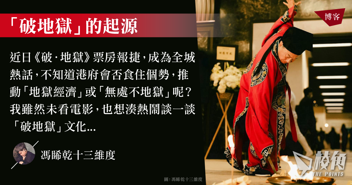 近日《破.地獄》票房報捷,成為全城熱話,不知道港府會否食住個勢,推動「地獄經濟」或「無處不地獄」呢?我雖然未看電影,也想湊熱鬧談一談「破地獄」文化。