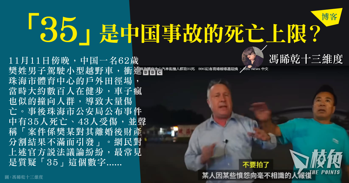 說了這許多,並非表示我相信中共黨媒公布的數字——超過35就一定是真?根本無法證實——只想指出「35上限」是一個容易令事件失焦的話題。今次黨媒公布35這個魔幻數字時,不管它是真是假,必然預計到網民將把話題扯到「死亡上限」,然後糾纏於死亡人數真偽,或忘記探究更深層更重要的問題:是什麼驅使樊姓男子驅車撞向人群?