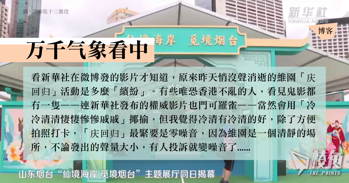 看新華社在微博發的影片才知道,原來昨天悄沒聲消逝的維園「庆回归」活動是多麼「繽紛」。有些唯恐香港不亂的人,看見鬼影都冇一隻——連新華社發布的權威影片也門可羅雀——當然會用「冷冷清清悽悽慘慘戚戚」揶揄,但我覺得冷清有冷清的好,除了方便拍照打卡,「庆回归」最緊要是零噪音,因為維園是一個清靜的場所,不論發出的聲量大小,有人投訴就變噪音了。