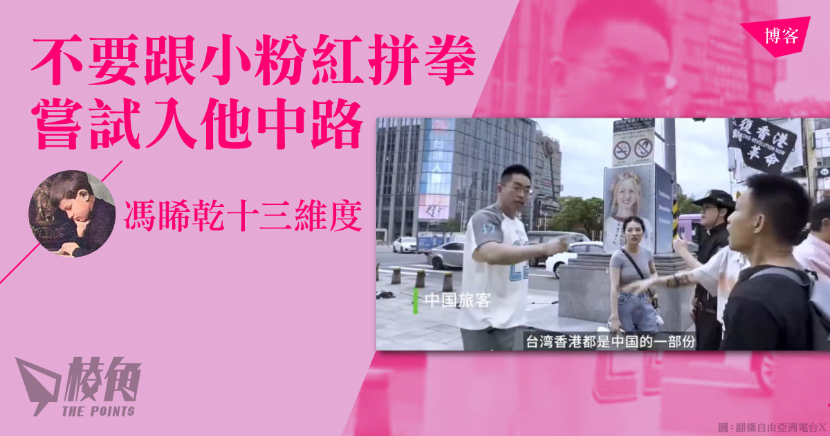 在台港人若不幸遇上這類小粉紅,我的建議是:不要跟他拼拳,嘗試入他中路。對方喃喃唸道「香港是中国的一部份,台灣也是中国的一部份,台灣、香港都是中国的一部份」,你不妨笑着問他:「海參崴是不是中国的一部分?中、俄昔日簽訂的璦琿條約、北京條約、滿洲里界約,你知道令中国失去多少土地嗎?」