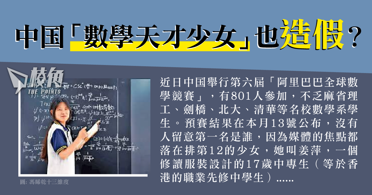 近日中国舉行第六屆「阿里巴巴全球數學競賽」,有801人參加,不乏麻省理工、劍橋、北大、清華等名校數學系學生。預賽結果在本月13號公布,沒有人留意第一名是誰,因為媒體的焦點都落在排第12的少女,她叫姜萍,一個修讀服裝設計的17歲中專生(等於香港的職業先修中學生)。