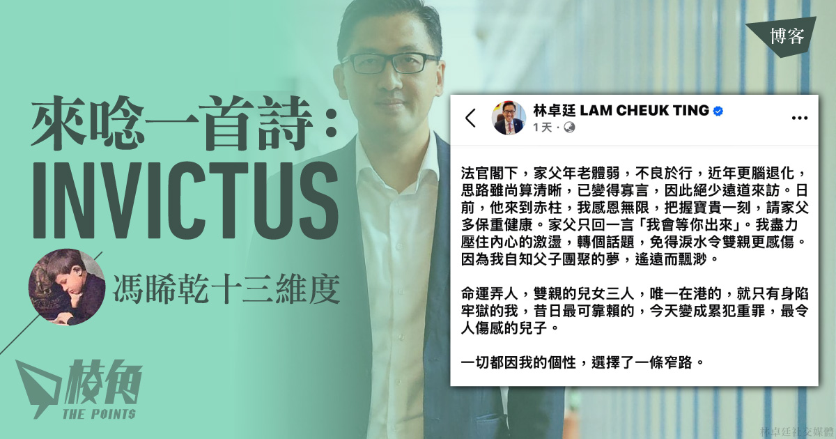 在求情信結束前,林卓廷還引用了蘇軾詩句:「人生到處知何似,應似飛鴻踏雪泥。泥上偶然留指爪 ,鴻飛那復計東西。」蘇東坡的詩當然好,但我覺得〈不屈〉更能體現林先生和其他獄中義人的精神。曼德拉當年被囚禁時,每逢懷憂喪志,就背誦Henley這首詩自勉。今天,不管你身在何方,我都推薦你唸(或再唸)這首激勵人心的詩。