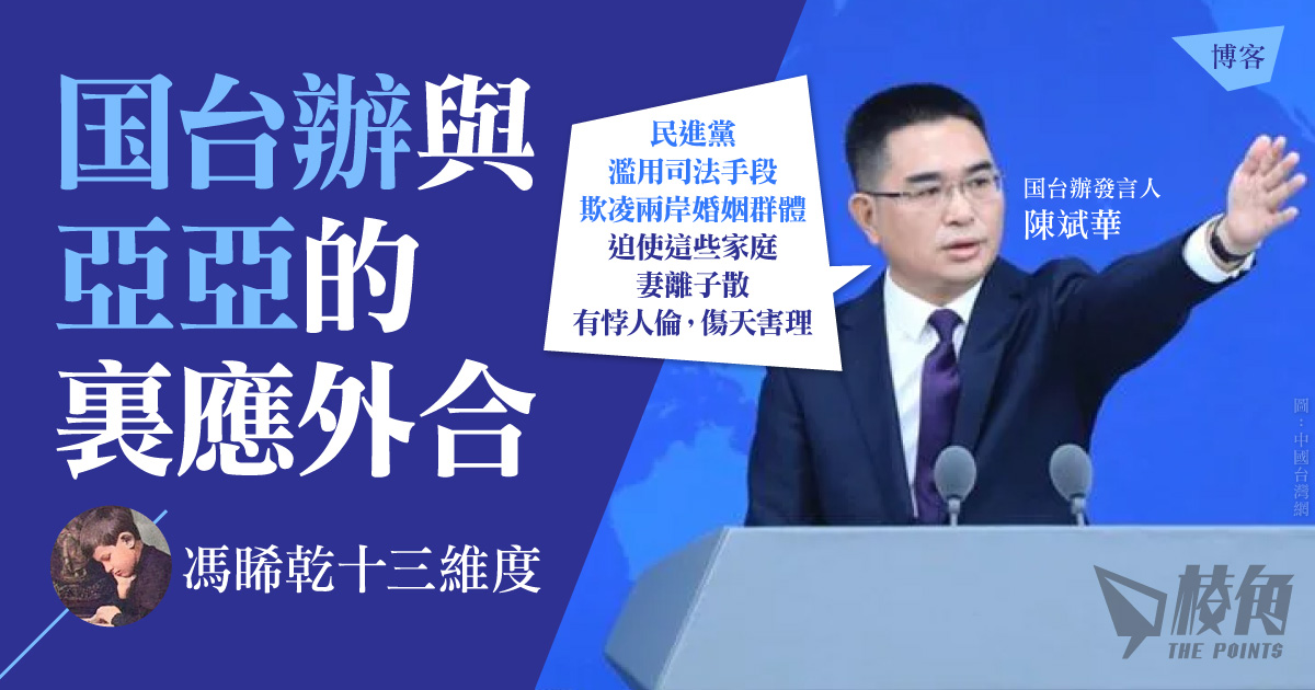 可惜這樣一樁皆大歡喜的好事,卻被中共斥為「傷天害理」。今早国台辦發言人陳斌華回應亞亞被送返中国一事,竟然說:「民進黨當局自詡『自由法治人權』,卻一再濫用司法手段欺凌兩岸婚姻群體,迫使這些家庭妻離子散,有悖人倫,傷天害理。」「濫用司法手段」這六個字出自共產黨的嘴巴,真是格外有說服力。
