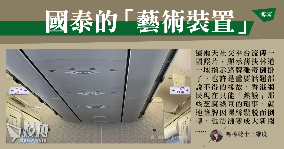 不禁想起兩個月前,朋友傳來他搭國泰飛機時拍下的奇趣照片(是他在現場親自拍的,肯定不是改圖):機艙內一個「出口EXIT」標誌居然上下倒轉了,看來不像螺絲鬆脫,而是一開始已經翻轉來掛。友人打趣說:「國泰做事真的一絲不苟!」
