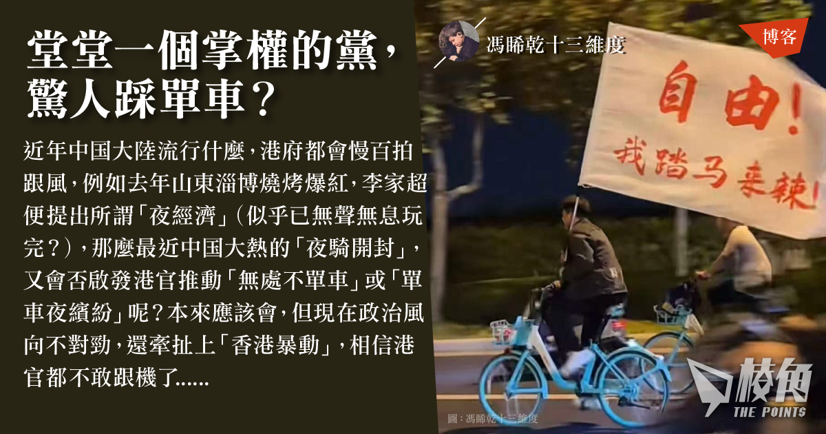 近年中国大陸流行什麼,港府都會慢百拍跟風,例如去年山東淄博燒烤爆紅,李家超便提出所謂「夜經濟」(似乎已無聲無息玩完?),那麼最近中国大熱的「夜騎開封」,又會否啟發港官推動「無處不單車」或「單車夜繽紛」呢?本來應該會,但現在政治風向不對勁,還牽扯上「香港暴動」,相信港官都不敢跟機了。